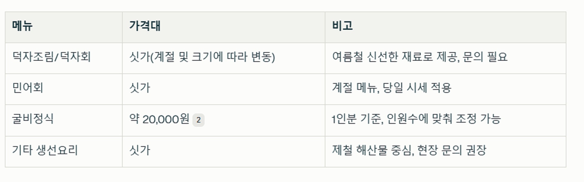 대표 메뉴 중 '덕자조림', '덕자회', '민어회' 등은 싱싱한 제철 생선을 사용하여 시가(당일 가격)로 제공됩니다.